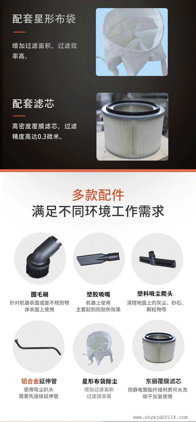1、工业吸尘器为碳钢,坚固耐用,桶壁光滑易清理,耐高温,耐撞击,